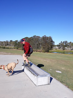 We visited a skatepark yesterday. It was an excuse to get out of the house, take Lucy for a walk and find a cache, of course.