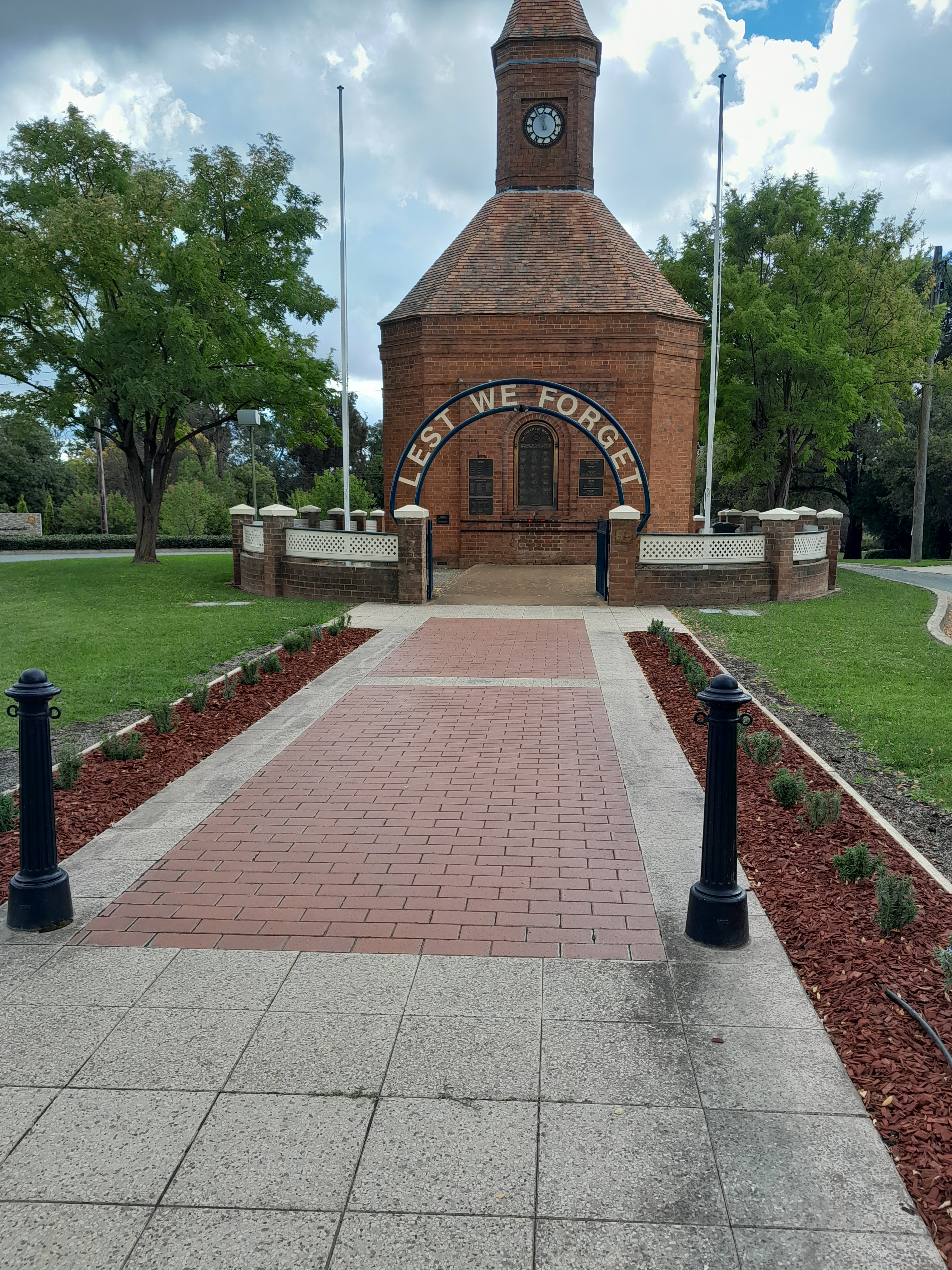 Beautiful entry with a clock in the tower, instead of numbers, it had ANZAC written above and below.